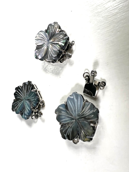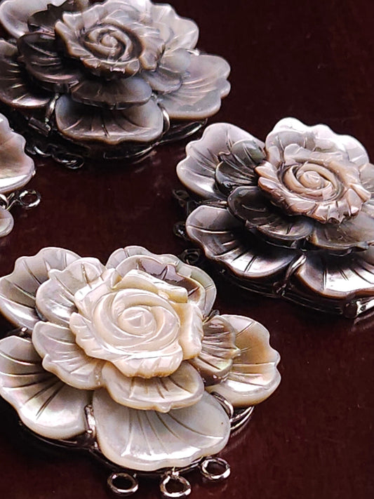 Handgeschnitzter Perlmuttverschluss mit schwarzer Lippe, MOP 3Loop Fancy Flower 43mm großer Verschluss, Schmuckherstellung Rhodium 3-reihiger Vintage-Verschluss