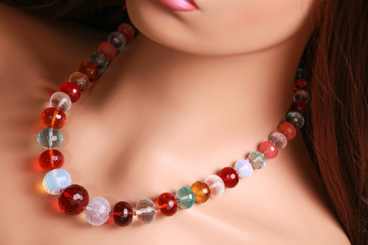 Halskette mit abgestuften Rondell-Elementen aus mehreren Quarzsteinen, Opalit, Erdbeere, Rutil, Ananas, Aquamarin, Rauchquarz, Blau, 50,8 cm lange Halskette