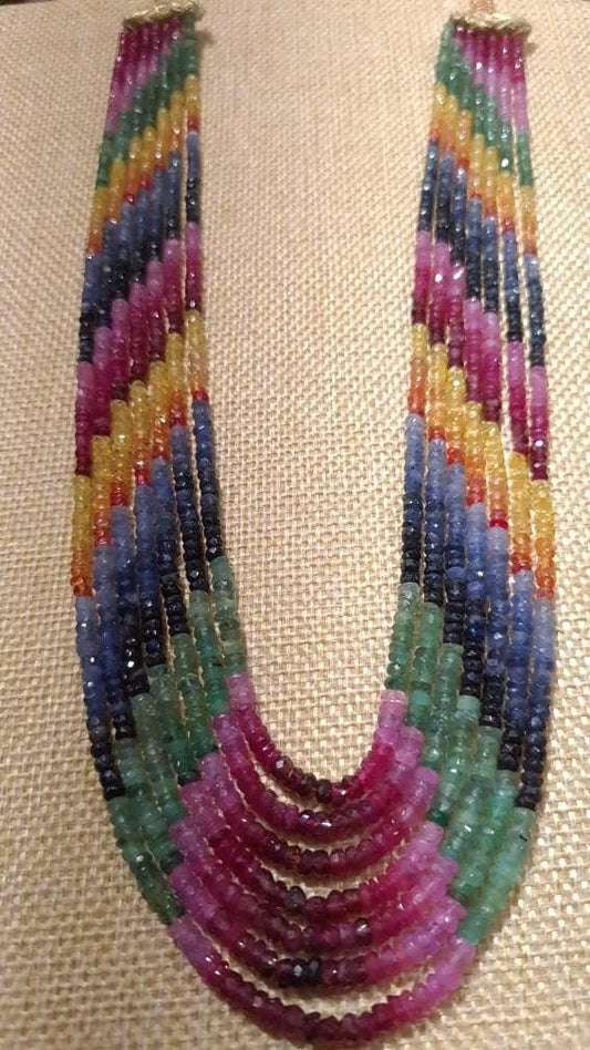 Natürlicher Multi-Saphir 7 Linien 3-4 mm abgestufter facettierter gemusterter Roundel-Edelstein AAA-Qualität 16,5" plus verstellbare Fadenhalskette,