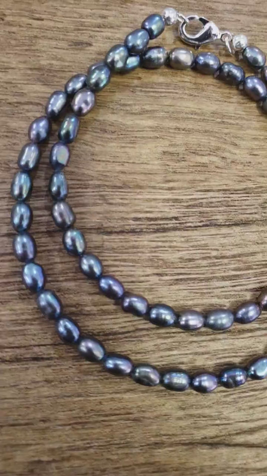 Natürliche Süßwasser-Pfauengraue Perle 4x6 Reis oval AAA Hochglanzperle in 925 Sterling Silber Halskette, Choker, Layering, Minimalistisch