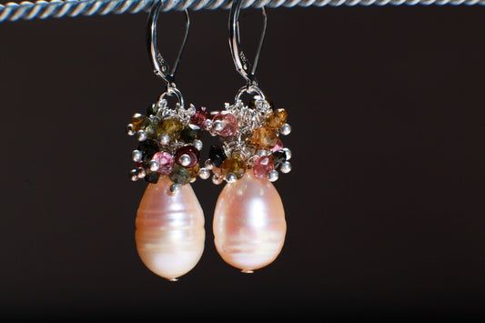 Echte Süßwasser-Barock-Pfirsichperle mit Wassermelonen-Turmalin-Cluster 925 Sterling Silber Ohrringe, Braut, Boho, Strandmode, handgemachtes Geschenk