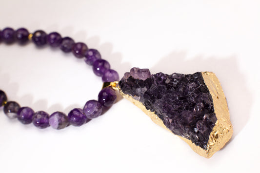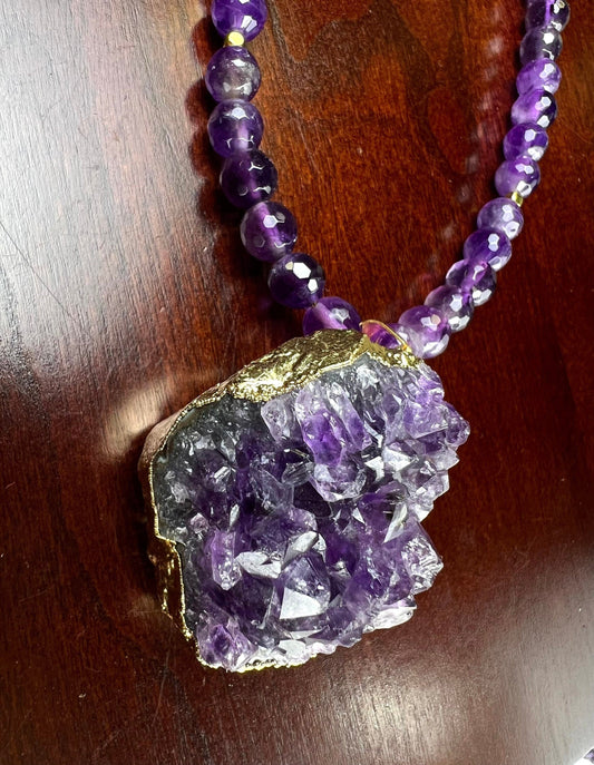 Amethyst-Geode, vergoldeter Druzy-Brocken, 30 x 35 mm lang, 20 mm dicker Anhänger, 8 mm natürliche facettierte Amethystperle, 18-Zoll-Halskette, 3-Zoll-Verlängerungskette