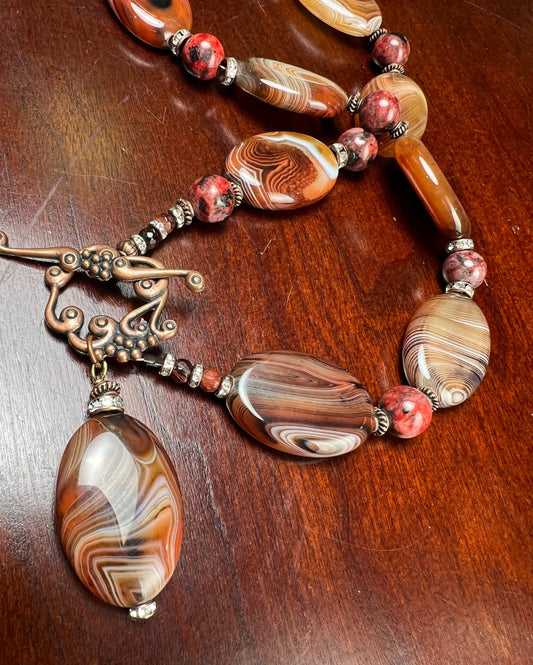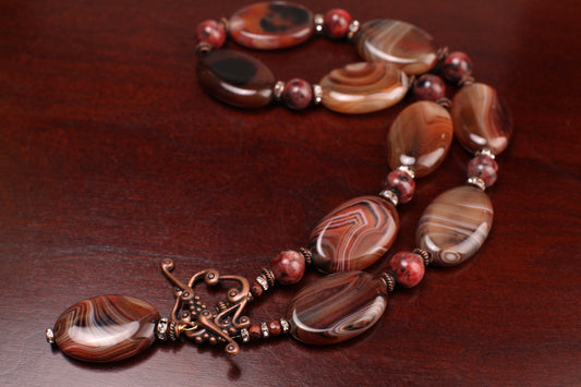 Echte gestreifte Achat-Halskette, glatt, oval, antikes Kupfer, ausgefallene Knebelverschluss-Vorderseite und Anhänger, klobige Statement-Halskette, 18 Zoll
