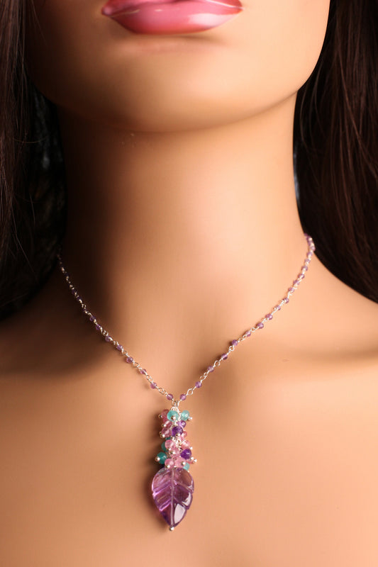 Anhänger mit geschnitztem Amethystblatt, Apatit, Granat, rosa Topas, Amethystcluster, Halskette mit Perlenkette aus 925er Sterlingsilber mit Drahtwicklung