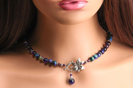 Galaxy Tiger Eye 8 mm glatt rund AAA-Qualität mit passendem Anhänger im Bali-Stil und Blumen-Knebelkette. Stärke