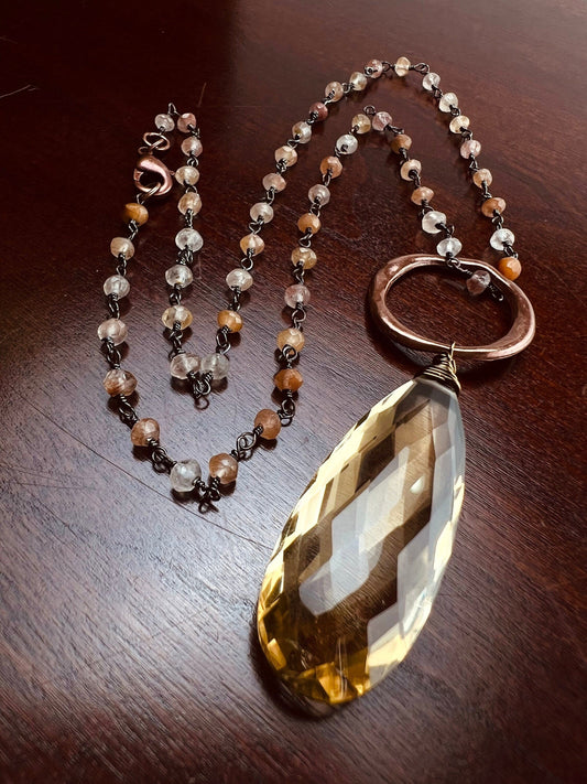 Natürlicher Citrin langer Tropfen 16x42mm Edelstein Qualität Anhänger,Hessonit Granat Kette,22mm antik Kupfer gehämmert Kreis schöne Halskette Geschenk