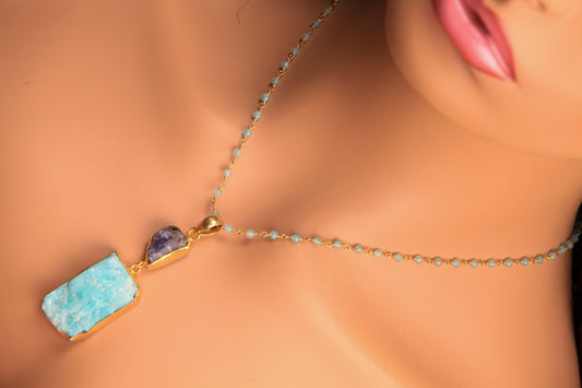 Handgemachte Halskette aus natürlichem Larimar und Amethyst mit 18 Karat Goldfassung, dazu passende Rosenkranzkette aus blauem Apatit. Viel Glück, heilendes Chakra