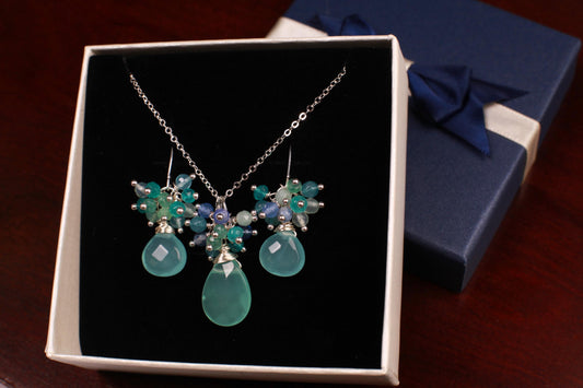 Natürlicher Aquamarin-Chalcedon, facettierter Tropfen in Birnenform, 13 x 21 mm, drahtumwickelte facettierte 4 mm himmelblaue Quarzcluster in 927er Sterlingsilber-Verschluss und Kette