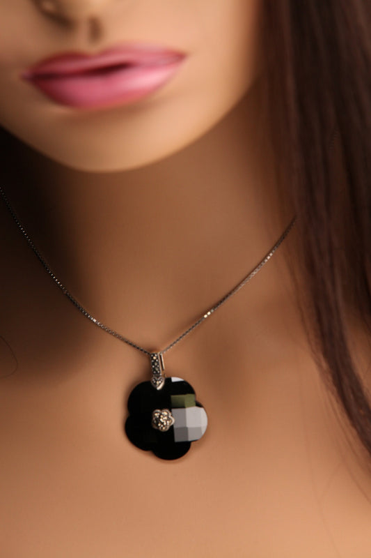 Schwarzer Spinell 925 Sterling Silber Markasit Vintage, Antiker Daisy Anhänger Passender 925 Sterling Silber Rhodium Box Kette 16",I8" Halskette