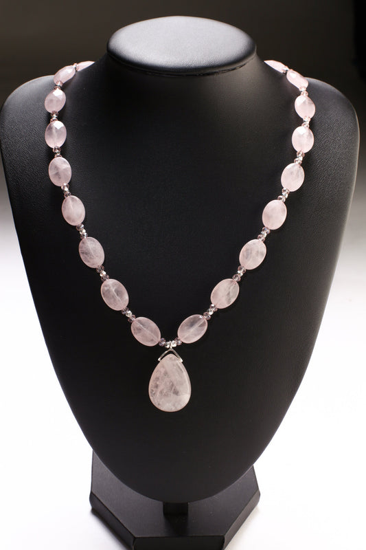 Rosenquarz aus Madagaskar, 10 x 14 mm, facettiert, oval, mit 18 x 25 mm facettiertem Tropfen-Mittelteil-Anhänger, 40,6 cm lange Halskette mit 7,6 cm langer Verlängerungskette