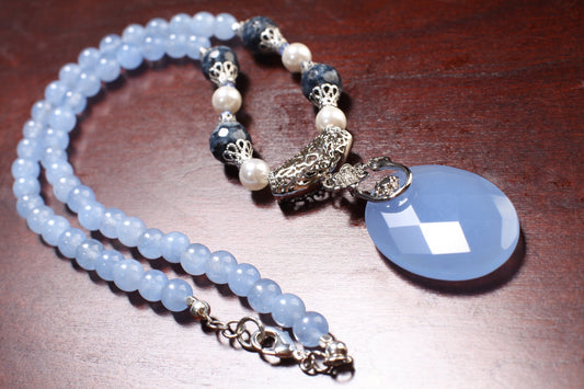 Ovaler Anhänger aus immergrünem blauem Chalcedon, 29 x 39 mm, mit schickem Rhodium-Bügel, Südsee-Muschelperle, Halskette im Bali-Stil, 8 mm, rund, 55,9 cm