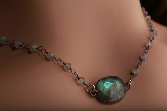 Echter Mondstein, Labradorit, Süßwasserperle, oxidierter Silberanhänger mit passender Edelsteinperlenkette mit Verlängerung 16"- 20"