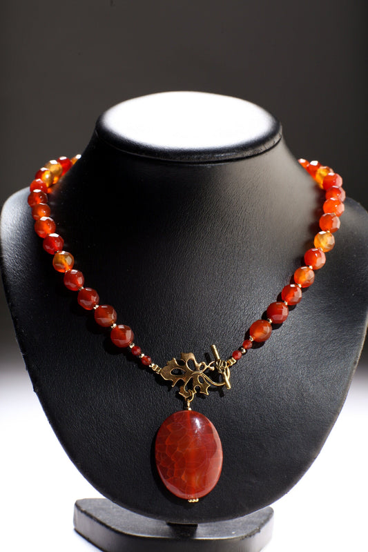 Karneol Halskette, Natürlicher Karneol facettiert mit baumelndem ovalen Feuerachat-Anhänger, antikgoldfarbener ausgefallener Blatt-Knebelverschluss, Geschenk