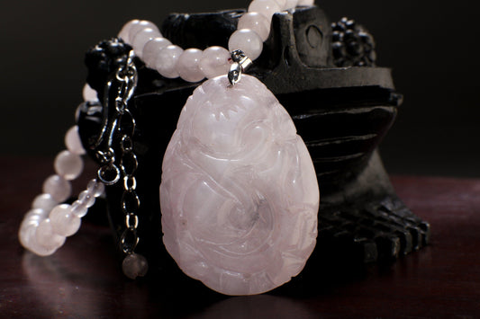 Halskette aus Rosenquarz, natürlicher Rosenquarz aus Madagaskar, 37 x 53 mm, handgeschnitzter doppelseitiger Pfirsichblüten-Anhänger im Vintage-Stil, 19 Zoll plus 2 Zoll Verlängerung.
