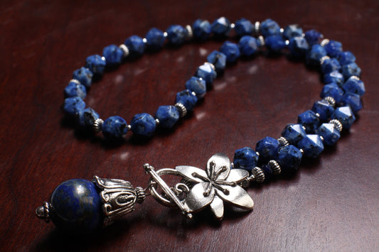 Lapislazuli-Anhänger mit ausgefallener Kappe und facettierter Sodalith-Halskette im Sechseck-Design, akzentuiert mit Perlen im Bali-Stil und einer Blumen-Knebelkette