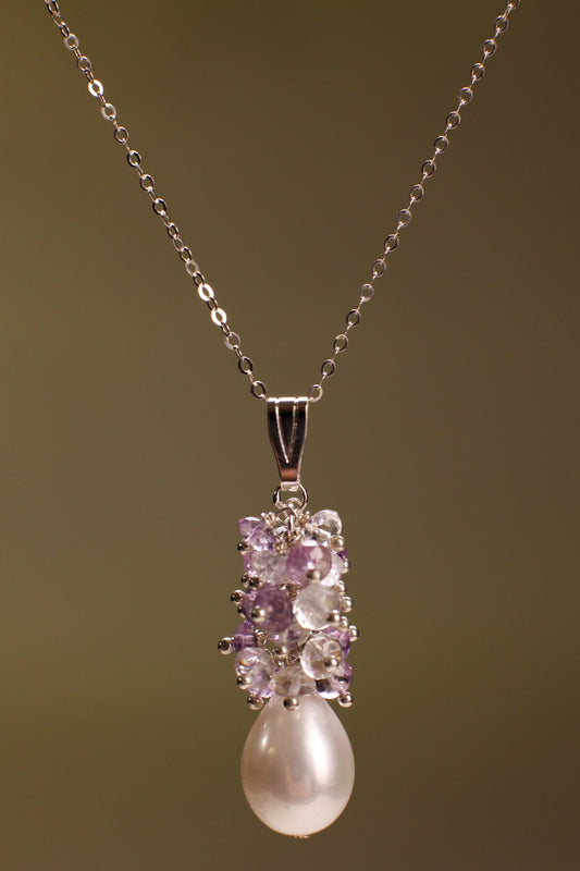 Südseeperlen-Briolette 13x18mm mit Edelsteinclustern Amethyst, Bergkristall in 925 Sterling Silber Kette Halskette, Minimalistisches Geschenk