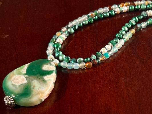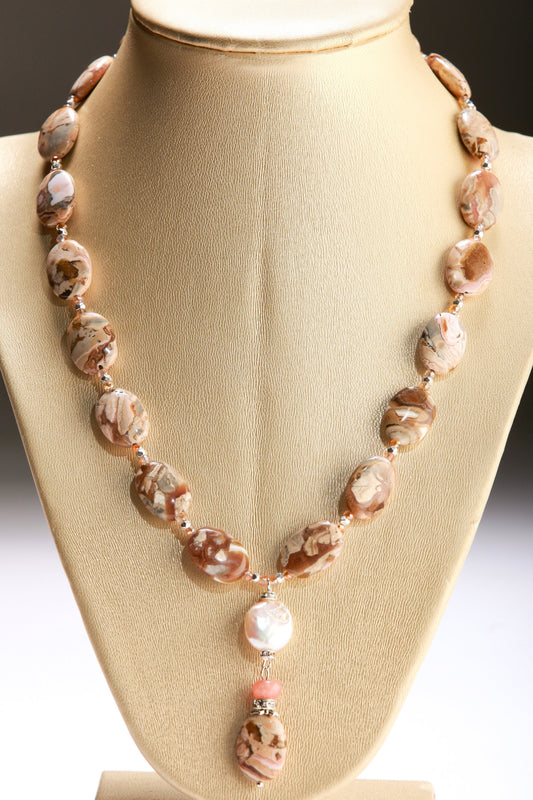Anhänger aus japanischem Blütenachat, passende Süßwasserperle und Feuerachat, 16" plus 2" Verlängerung, Statement-Halskette, schönes Geschenk