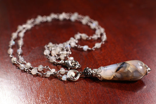 Echter Feuerachat-Anhänger in Tropfenform, 12 x 32 mm, mit grauem Mondstein umwickelte, drahtumwickelte, handgefertigte Halskette aus oxidiertem Silber, 50,8 cm.