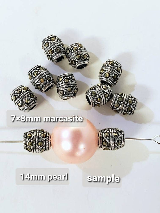 2 Stück Markasit 925 Sterling Silber 7×8mm, 3mm Loch, ovale Trommel Vintage Spacer Perle, Schmuckherstellung Halskette Armband Ohrringe Spacer