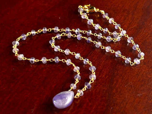 Natürlicher Tansanit 9x13mm ca. Tropfenform, drahtumwickelter Tansanit 4mm, Rosenkranz-Goldkette, Geburtsstein für Dezember, violetter Edelstein, elegantes Geschenk