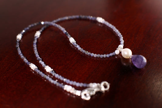 Natürlicher, farblich abgestimmter Iolith-Runddiamant im Ombre-Ton, 2,5 mm, mit Süßwasserperlen-Abstandshaltern und Iolith-Anhänger-Halskette