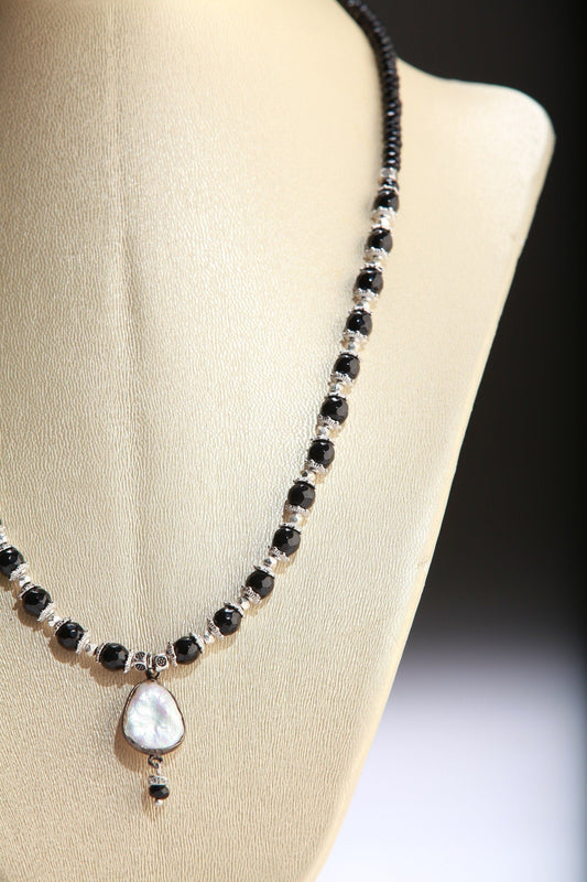 Perlenkette Schwarzer Onyx Facettiert Edelstein Rund und Rundel mit 13x15mm Süßwasserperle Mittelstück Tropfen Fokal Statement Halskette