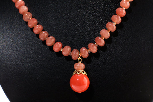 Pfirsichfarbene Aventurin-Halskette mit facettierten Rondell-Anhängern und lachsfarbenen Südsee-Muschelperlen, Goldkette + 7,6 cm Verlängerungskette