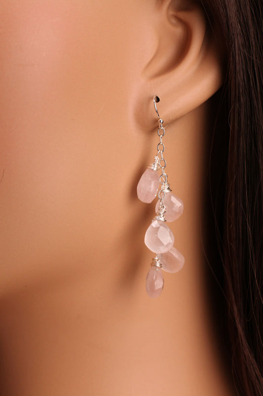 Natürlicher Madagaskar Rosenquarz facettiert Herzform Tropfen Draht umwickelt Kaskade Sterling Silber Leverback oder Ohrhaken