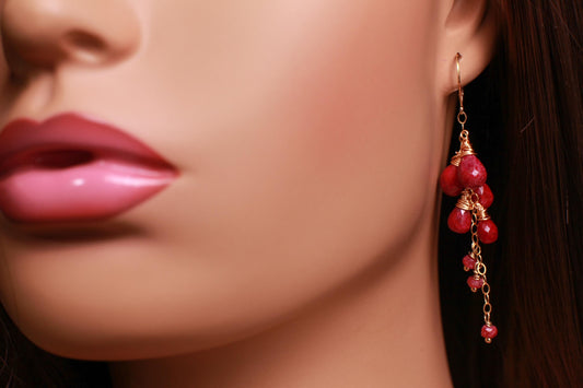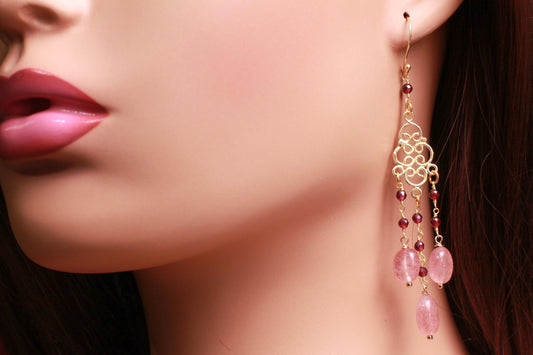 Natürliche Erdbeerquarz Kronleuchter Ohrringe, Facettierte Granatdraht gewickelte Gold Vermeil Ohrringe, Gold über Sterling Silber Ohrringe