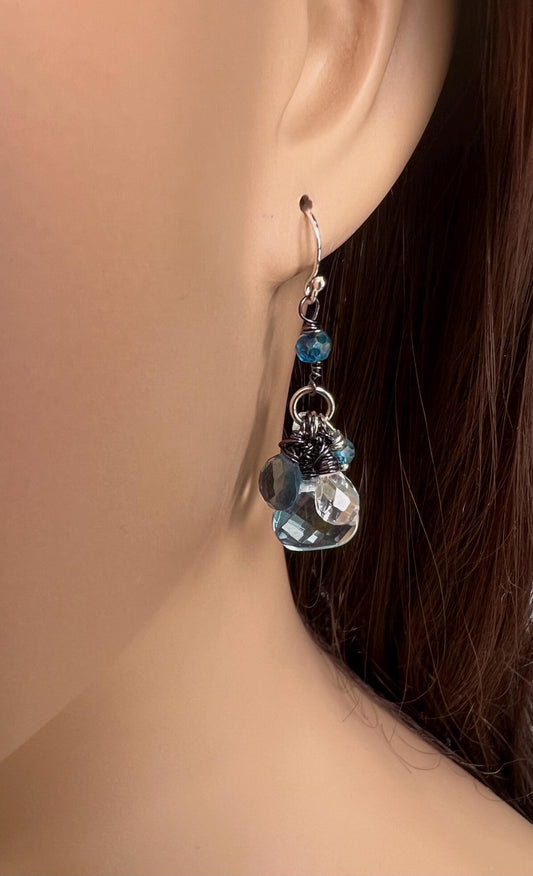 Ohrringe aus Londoner Blautopas, Aquamarinquarz und Bergkristall.