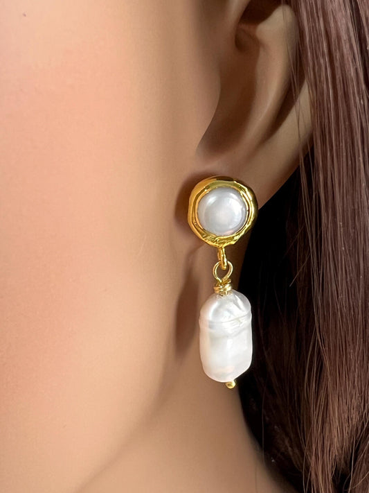 Natürliche Süßwasser-Biwa-Perlen-Ohrstecker mit Süßwasserperlen-Goldfassung.