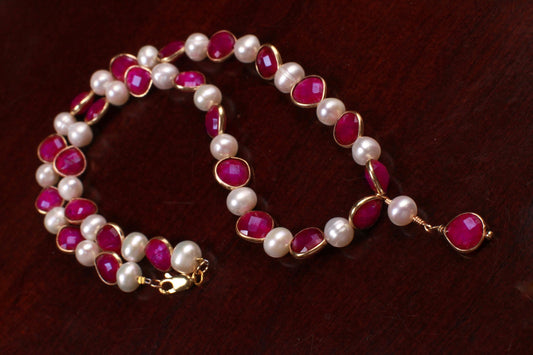 Genuine Ruby Heart shape Bezel with Fresh Water Pearl 22k Gold vermeil pendant necklace purplish pink Valentine, Bridesmaid,Gift for her