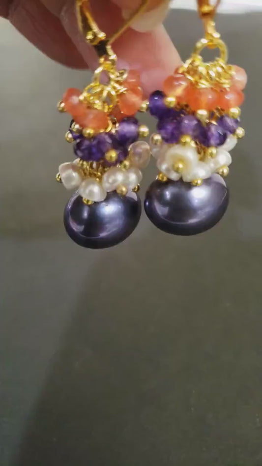 Ohrringe mit mehreren Edelsteinclustern, Karneol, Amethyst, Süßwasserperle, violette Südseeperlen-Edelstein-Bügelohrringe