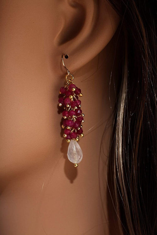 Mondstein Briolette Tropfen, Echte rosa Rubin Cluster in 14K Gold filled Ohrringe, Boho, Edelstein Schmuck Geschenk für Sie