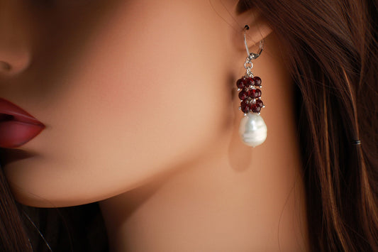 Echter Granat Cluster Draht gewickelt Baumeln mit Südmuschel Barockperle 925 Sterling Leverback Ohrhaken, Braut, Boho, Geschenk für Sie