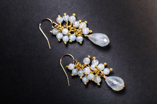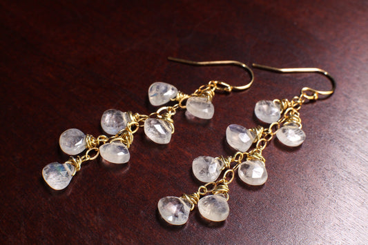 Mondstein-Ohrring, echte Mondstein-Cluster und Tropfendraht, umwickelt mit 14 Karat Gold gefülltem Ohrdraht, Geburtsstein für Juni, Braut, weißer Ohrring, Geschenk