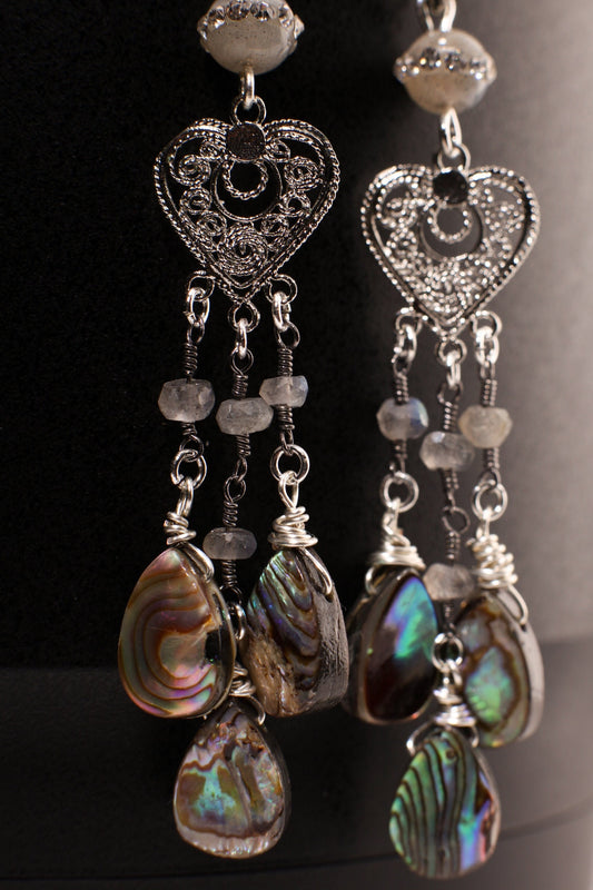 Echtes Abalone-Tropfen-Herz, baumelndes filigranes Kronleuchter-Herz, facettierte Labradorit-Draht-umwickelte Silberohrringe, handgefertigtes Geschenk für Sie