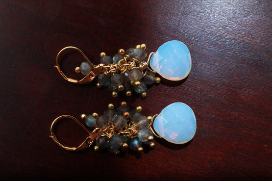 Natürliche Labradorit-Cluster und Opalit 12 mm facettierte Herz-Briolette in Gold-Leverback, handgefertigter Edelsteinschmuck, Geschenk für Sie