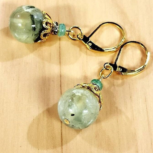 Natürliche Prehnit-Ohrringe, 12 mm, glatt, rund, Gold. Schöne elegante handgefertigte minimalistische Ohrringe aus natürlichem Edelstein als Geschenk
