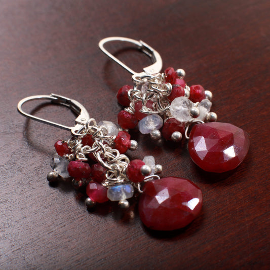 Echte Rubin-Herz-Briolette-Tropfen, echte Rubin- und Mondstein-Cluster in 925er Sterling-Silber-Hebelohrringen, Edelstein-Schmuck-Geschenk