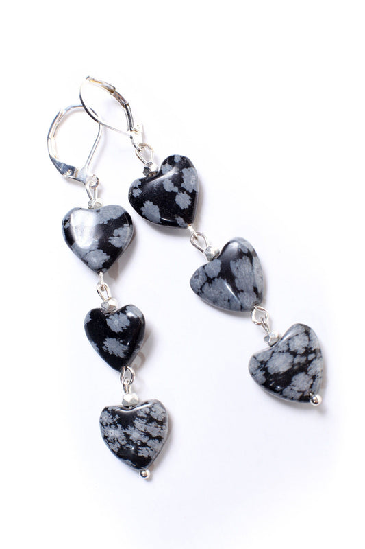 Schneeflocken Obsidian 12mm Herz, baumelnde 3 Herzen, Silber Leverback Ohrringe, Vintage Natürlicher Edelstein Handgemachtes Geschenk für Sie