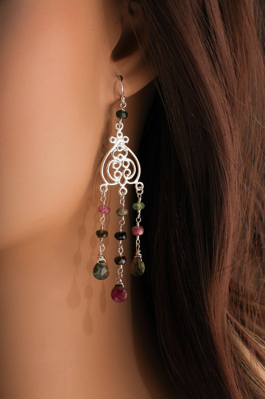 Wassermelonen-Turmalin-Ohrringe, drahtumwickelte baumelnde Briolette in 925 Sterling Silber Kronleuchter und Ohrbügel, Braut, Boho, handgemachtes Geschenk