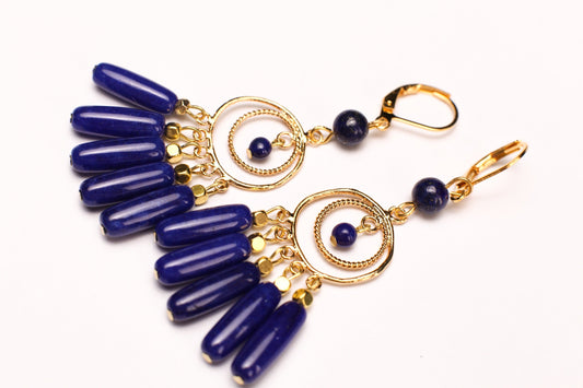 Lapislazuli Baumelnde Röhren-Kronleuchter-Ohrringe, Brautjungfern, Boho, handgefertigter Edelstein, Leverback-Ohrbügel, Geschenk für Sie