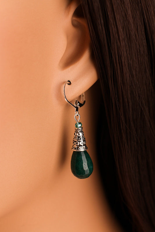 Dunkelgrüner Smaragd-Jade 10x14mm Tropfen mit Kegel im Bali-Stil, Viktorianischer Stil, Silber Leverback Ohrringe, Geschenk für Sie