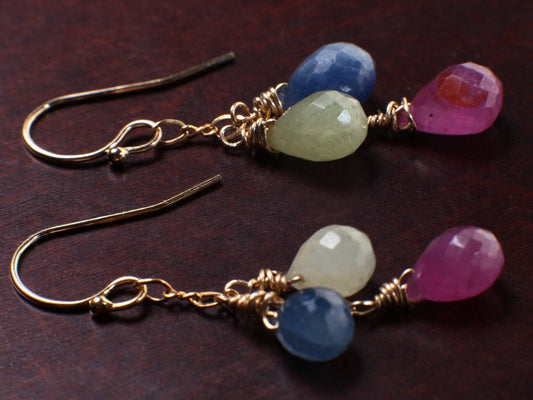 Saphir-Ohrringe, echte Multi-Saphir-Briolette, drahtumwickelte Träne in 14K Gold gefüllter Ohrhaken