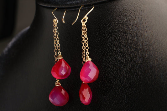 Hot Pink Chalcedon 12x13mm Briolette Draht umwickelt Teardrop, in 14K Gold gefüllt Dangle Kette & Ohrhaken Boho Edelstein Schmuck Valentinstag Geschenk