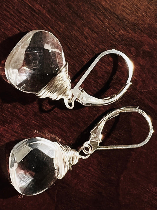 Natürlicher Bergkristall, facettiertes Herz, in Tropfenform, drahtumwickelt, 12 mm Tropfen in Sterlingsilber, Leverback oder Ohrhaken, Valentinstagsgeschenk