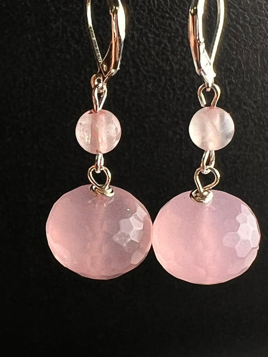 Natürlicher Rosenquarz, facettiert, großes Rondell, 14 mm, Abstandshalter, 4 mm, Rosenquarzdraht, umwickelt mit silberner Leverback- oder Ohrhaken-Optik