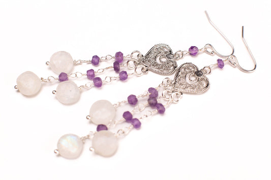 Natürlicher Mondstein baumelnd mit natürlichem Amethyst Filigran Kronleuchter Draht gewickelt 925 Sterling Silber Ohrringe, handgemachtes Geschenk für Sie