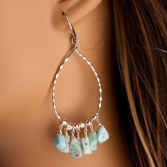 Natürlicher Larimar Rohform Tropfen 7x10-8x11mm baumelnd, Rhodinierte Tropfenohrringe, Heilkristall, Geburtsstein Dezember